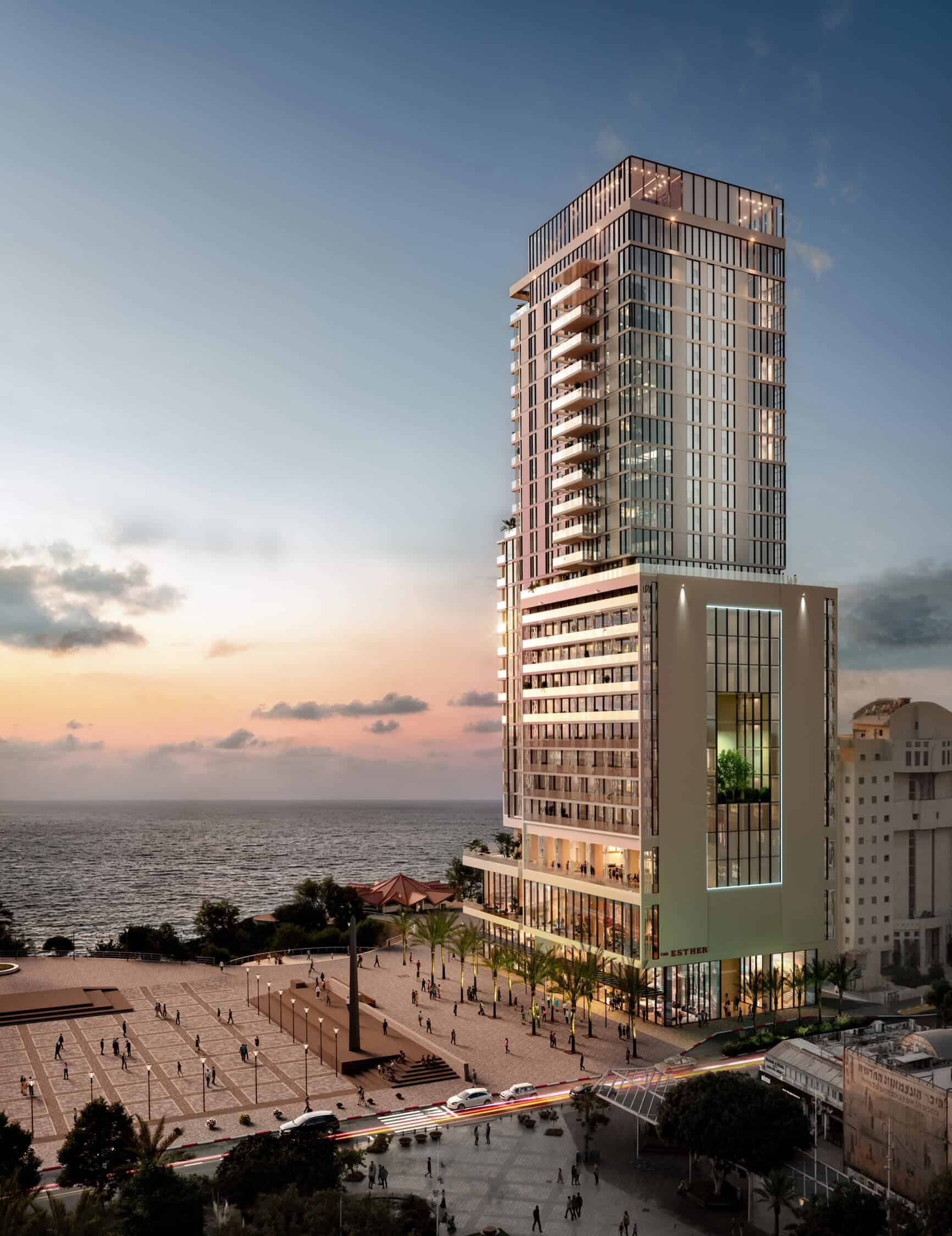 The Esther was designed as two long rectangular buildings, incorporating into one another to create a kind of yin & yang construction. The complex’s center boasts a 27-floor tower over 4 underground levels. Eight floors are dedicated to the Gordonia Hotel, with the upper floors reserved for residents. The residential floors will have a separate entrance, three separate elevators, and an external elevator for the parking lots.